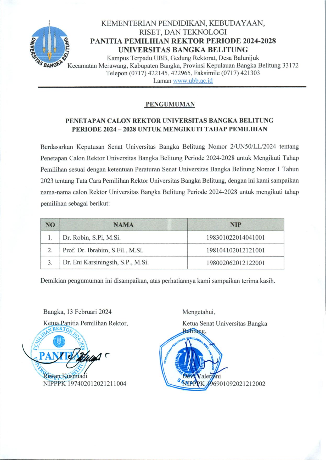 Penetapan Calon Rektor Universitas Bangka Belitung Periode 2024-2028 Untuk Mengikuti Tahapan Pemilihan
